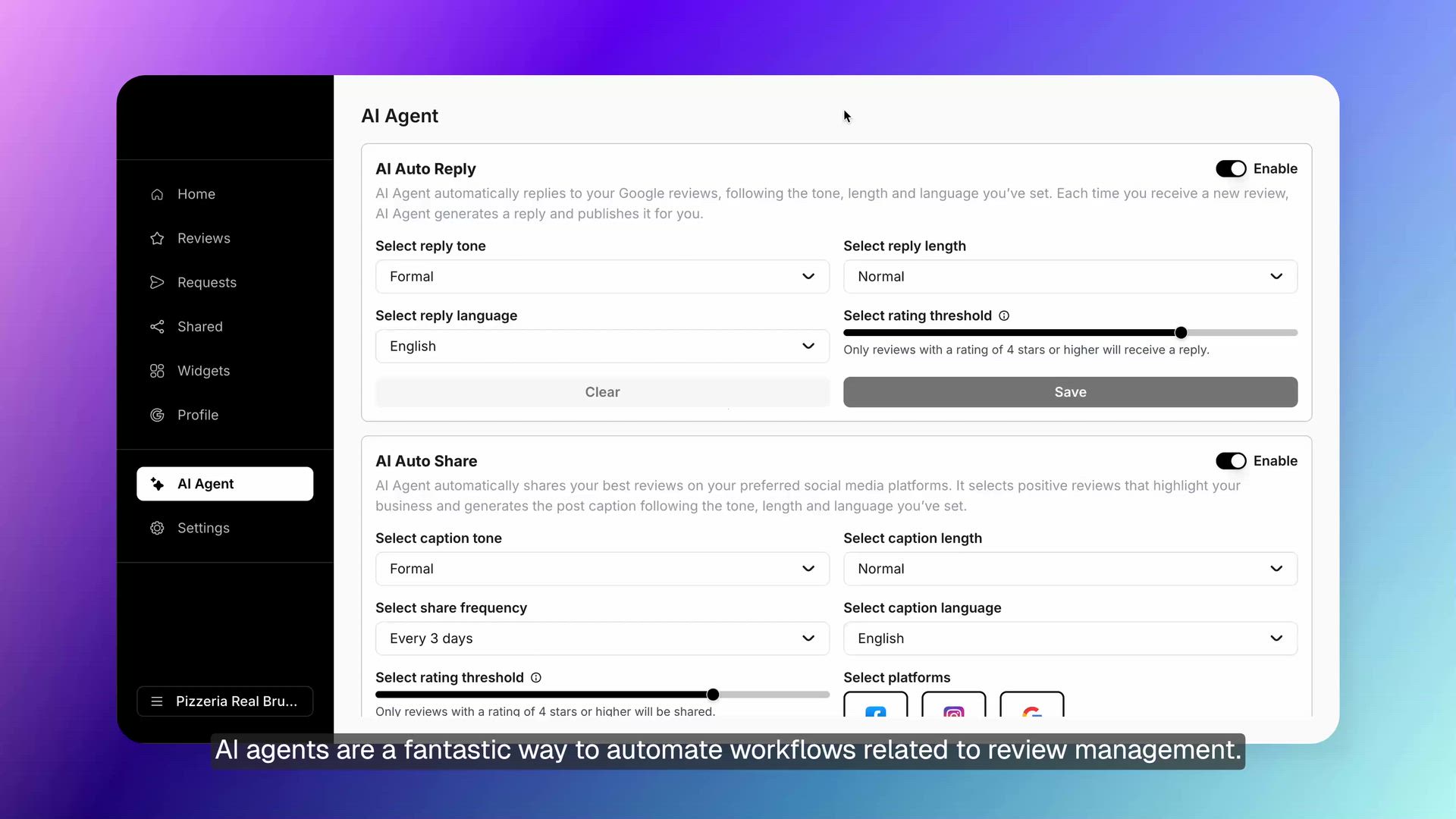 Once configured, these AI agents work continuously without requiring your attention. They respond to reviews, share content, and maintain your online presence automatically according to the rules you set up.
